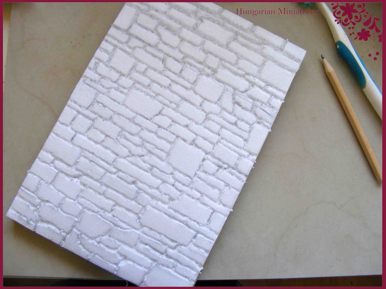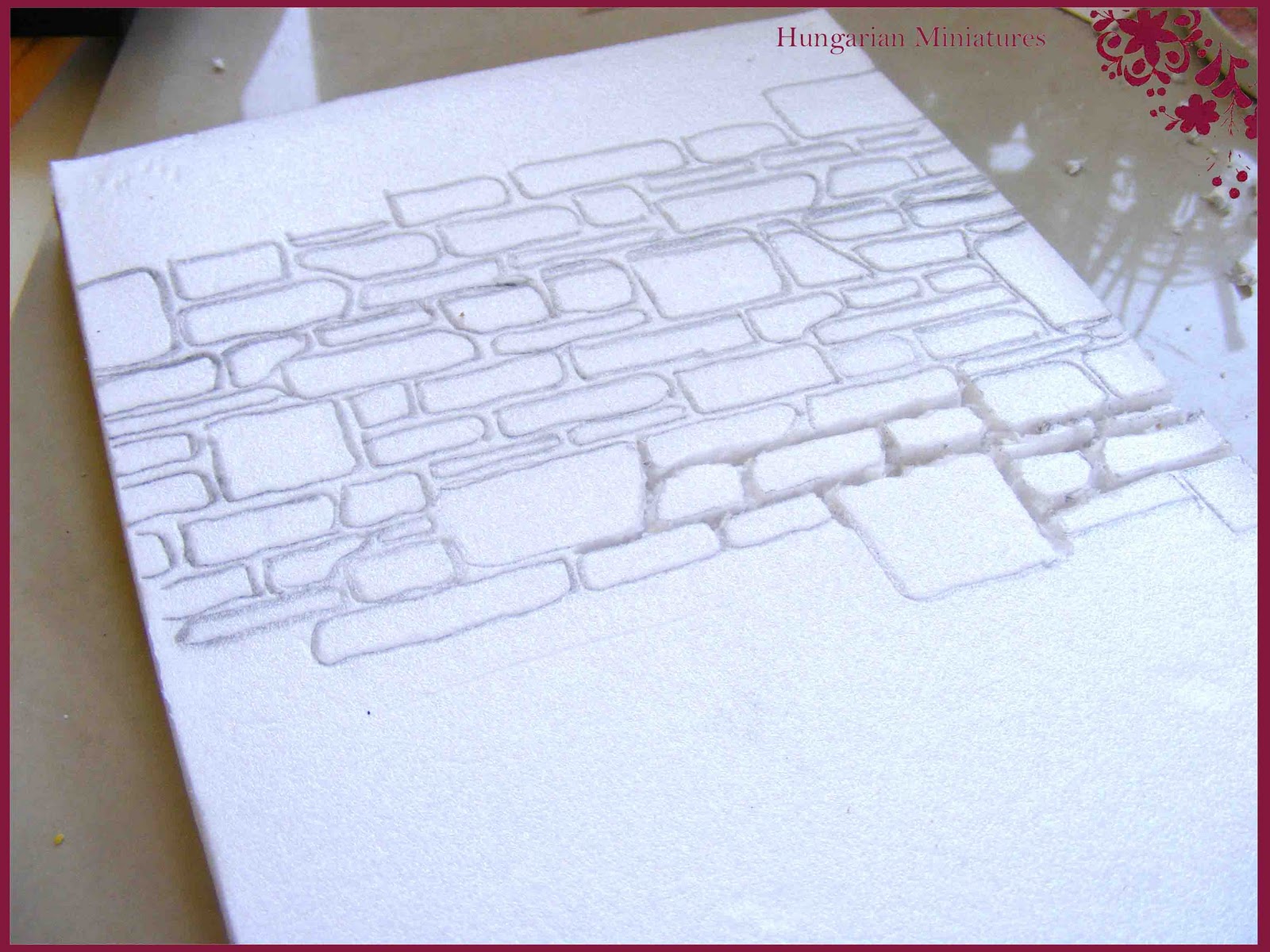 A bemutatóra készített jeleneteim közül az utolsó egy szüreti beállítás volt, amelynek a hátteréhez egy kőfalat "építettem". Semmi drága dolgot nem használtam hozzá, mint oly sok más esetben, most is kukáztam a legfontosabb alapanyagot. Depron lapot használtam hozzá, amit a makettezők igen gyakran alkalmaznak, mivel nagyon könnyű és a megmunkálása is egyszerű. Ez egy styrofoam hab, amit lapkban is meg lehet vásárolni hobbyboltokban, de még egyszerűbb, ha az egyik bevásárlásunk után nem dobjuk ki a vákumcsomagolt hús fehér habtálcáját. Én is így jutottam hozzá. Persze ezzel csak egy kisebb méretű falat tudunk csinálni, de nekem most nem is kellett nagyobb. Miután levágtam a peremét, kaptam egy szép hablapot, amire szabad kézzel rárajzoltam a mintát. Inspirációért kereshetünk különböző rakásmintákat a neten, esetleg ki is nyomtathatjuk, és karbonpapír (indigópapír) segítségével átvetíthetjük a depronra. Ezután egy hegyes eszköz segítségével véssük ki a fúgák vonalait. Én egy tűreszelőt használtam, de alkalmas lehet egy műszerész csavarhúzó vagy egy ár is.