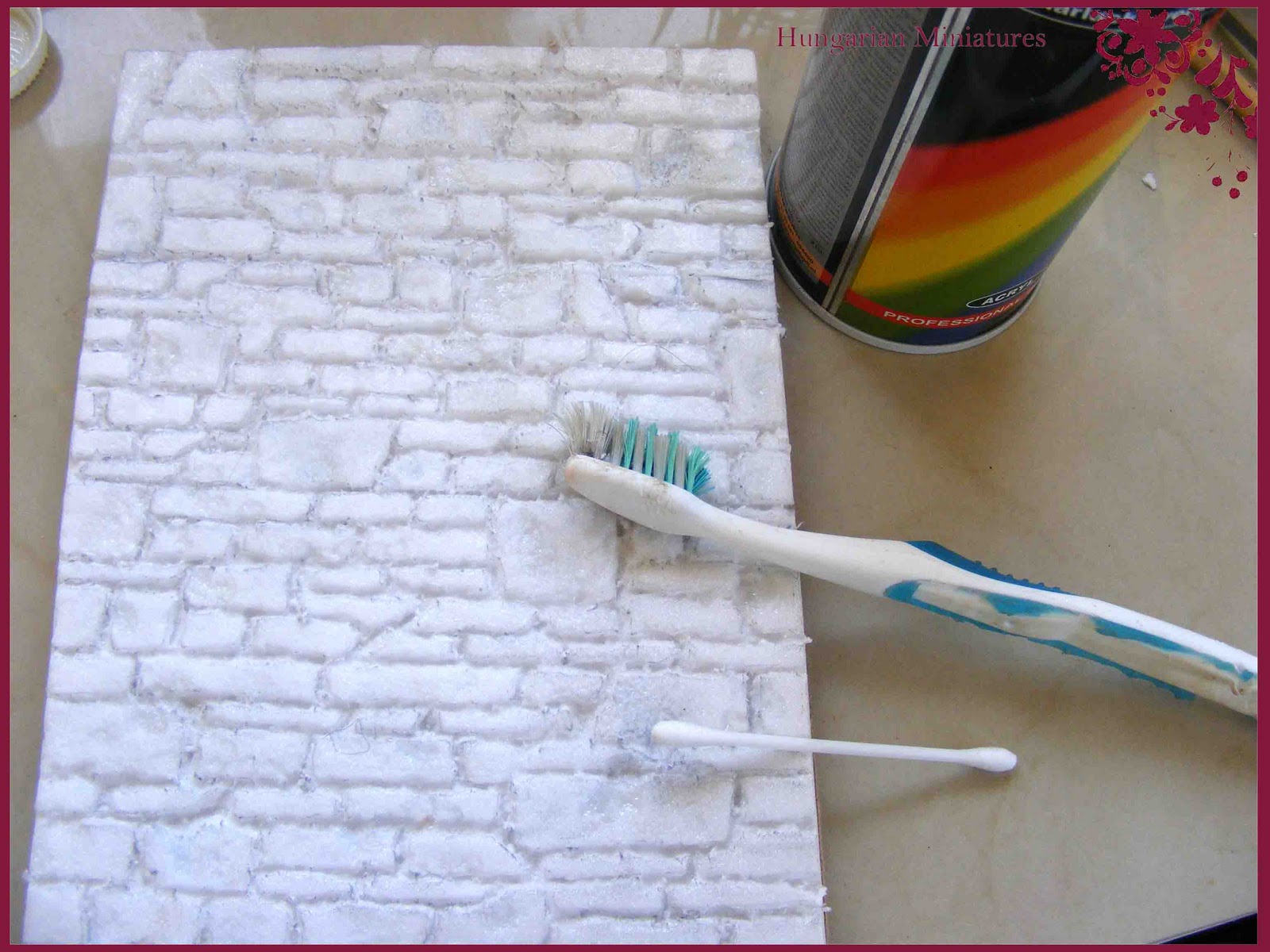 Miután bevéstük a mintázatot, egy kicsit tönkre kell tennünk a kövek felületét is, hogy ne legyenek olyan tökéletesen simák. Erre a legalkalmasabb az akryl alapú lakkspray. Ez ugyanis oldja a depronhabot, szépen felmarja a felületét. Fújjuk be vele a kőfalunkat, majd egy fogkefével nyomkodjuk be. Ezzel érdes, szemcsés lesz a kő. Ott, ahol mélyebb bemaródásokat szeretnénk elérni, más módszert kell alkalmaznunk. Én egyszerűen kifújtam egy kevés lakkot egy kis tálkába, és egy fültisztító pálcikát nyomkodtam bele. Ezzel a "maró szerszámmal" elkezdtem mélyedéseket nyomkodni itt-ott a kövekbe.